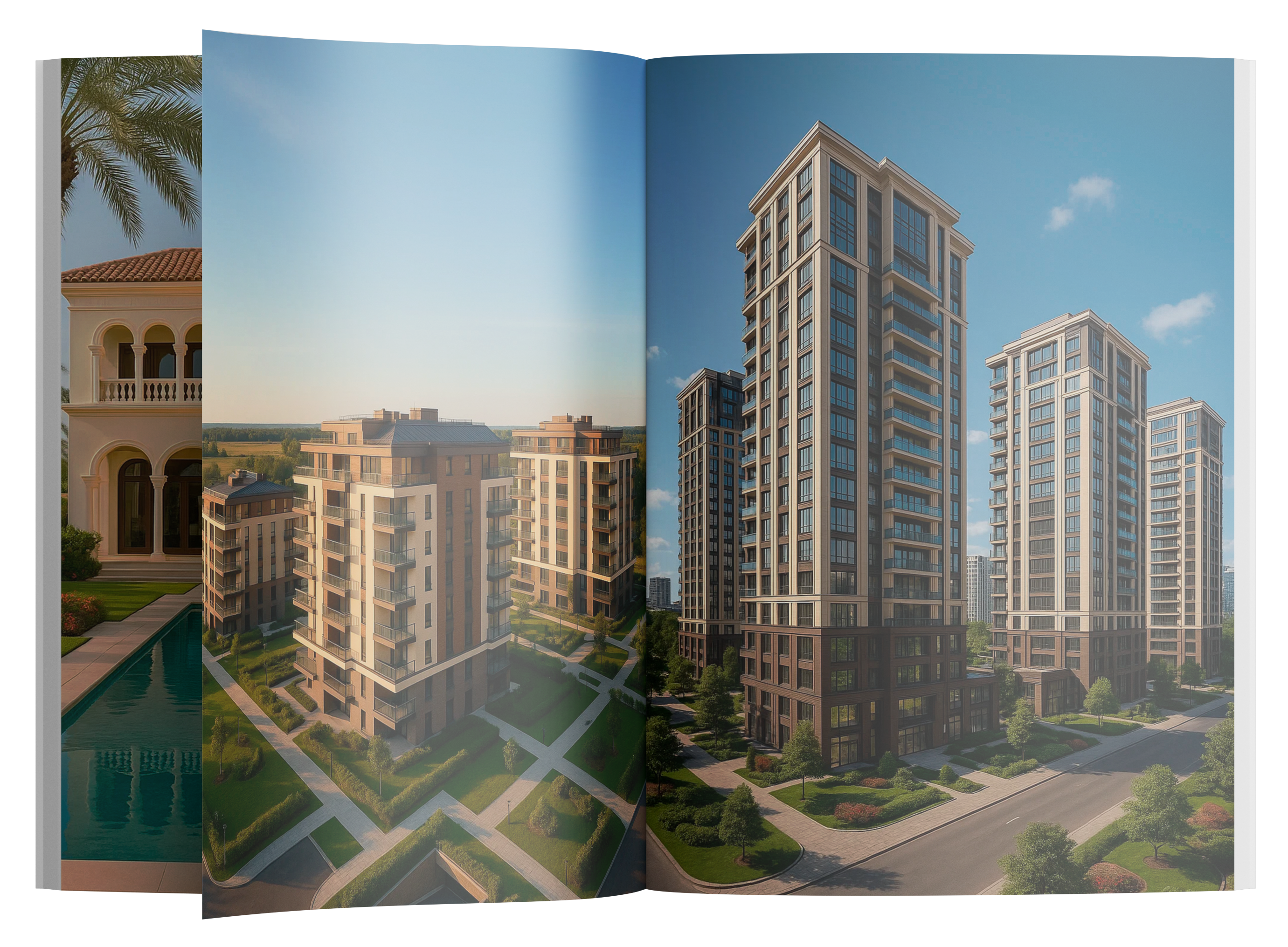 Комплекс включает семь 9-этажных зданий с двухуровневыми парковками